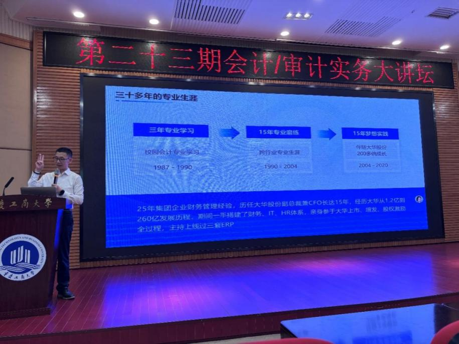 魏美钟董事长以三十余年的会计与财务管理实战经验为基石,在讲座中首先分享了自身专业成长路径与企业实践经历。他提到,自己的职业生涯始于校园专业学习,随后历经15年的跨行业专业磨练,之后又以大华股份副总裁兼CFO的身份,期间,他一手搭建起企业财务、IT、HR一体化体系,并主持上线三套ERP系统,25年的集团企业财务管理经验让其观点兼具理论高度与实务温度,为师生们搭建起“校园知识”与“行业实践”的桥梁。