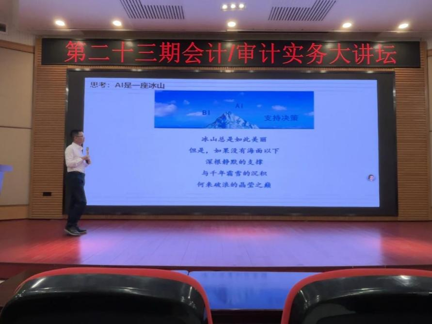 围绕“大数据+AI,会计专业自信的底气”核心主题,魏美钟董事长提出多个深刻见解。他以“AI是一座冰山”为喻,指出大众所见的“支持决策”等BI功能仅是“冰山之巅”,而海面之下“深根静默的支撑”与“千年霜雪的沉积”——即底层数据积累、技术架构搭建、业务逻辑梳理等基础工作,才是AI在会计领域发挥价值的核心前提。这一比喻打破了师生对AI应用的表层认知,强调了专业基础与技术底层建设的重要性。
